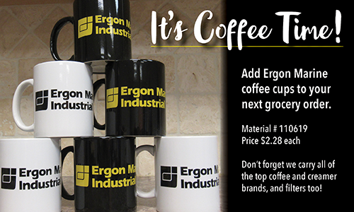 Now you can add Ergon Marine coffee cups to your grocery order! Ask for material #110619 and specify how many you want of each color, black or white. Price is just $2.28 each. While you’re at it, add your favorite coffee, creamer and filters to your order!