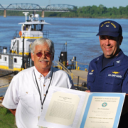 Danny Koestler, Ergon Marine & Industrial Supply (EMIS) Vice President, recently accepted a Meritorious Public Service Award from the Department of Homeland Security and the United States Coast Guard, presented by Tim Wendt, Captain of the Port, Memphis Sector, Lower Mississippi River. EMIS was commended for “proactive casualty response actions, leadership, and contributions.”